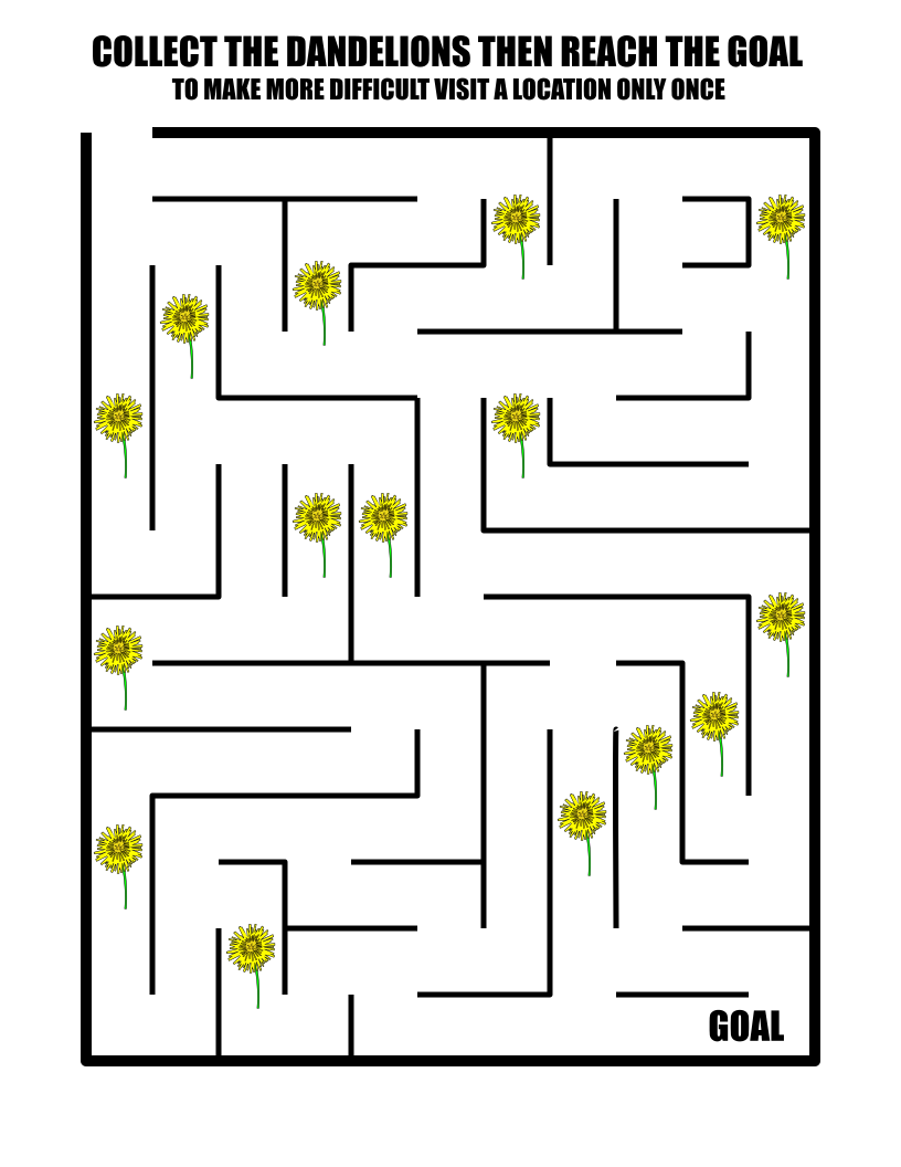 We dive into the flower or weed maze depending on your perspective with a Dandelion Maze. This is the 49th maze in a series of 100 mazes. If you hit the download button below you will be able to print page 49 of the book.