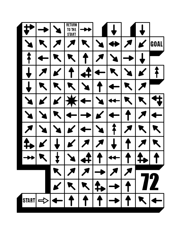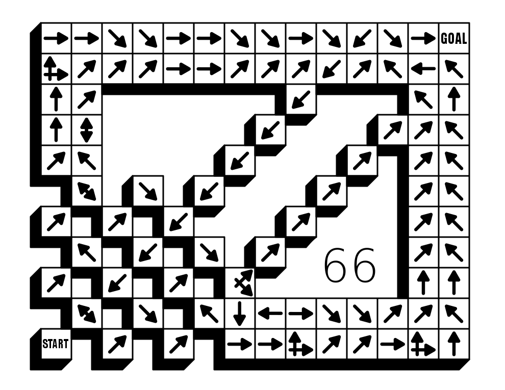 My next example uses a total of 3 All Ways Arrows which adds a unique experience for the solver. After the initial choice from the START, the maze uses only regular arrows, so your only choices happen when you land on an All Ways Arrow. So you go from no choice to many choices (six, six and seven choices by my count). Try it and see what you think.