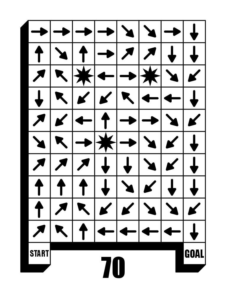 This 8x9 Arrow Maze contains 70 solving blocks (72 minus the START and GOAL) and 13 decisions, or roughly one every 18.5% of blocks (vs. my first example 13/115 =11% of blocks). So despite being a smaller maze by 37% you are much more likely to get lost in it (in theory).