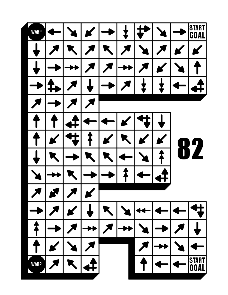 And it must be said that a great way to use Warp blocks is to travel between two disjointed sections like in the example below. Yes, I could have used double arrows to jump the gaps….but this version essentially creates an initial arrow maze (whose goal is the first Warp), and then a second Arrow Maze from the Warp to the Goal.